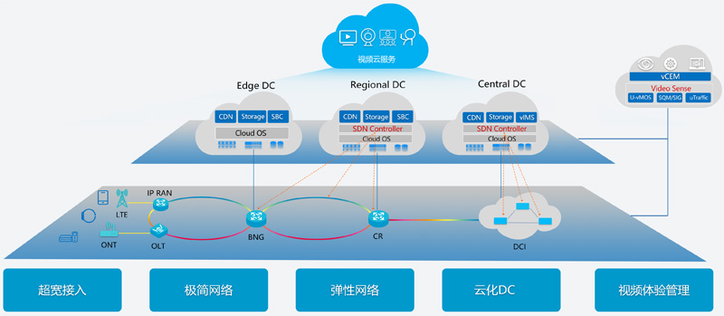 1)弹性容量:践行All Cloud战略,通过NFC(Network Function Cloudification)实现CDN、SBC、存储和计算的云化,满足视频业务突发性的网元容量和处理能力的 弹性伸缩能力;